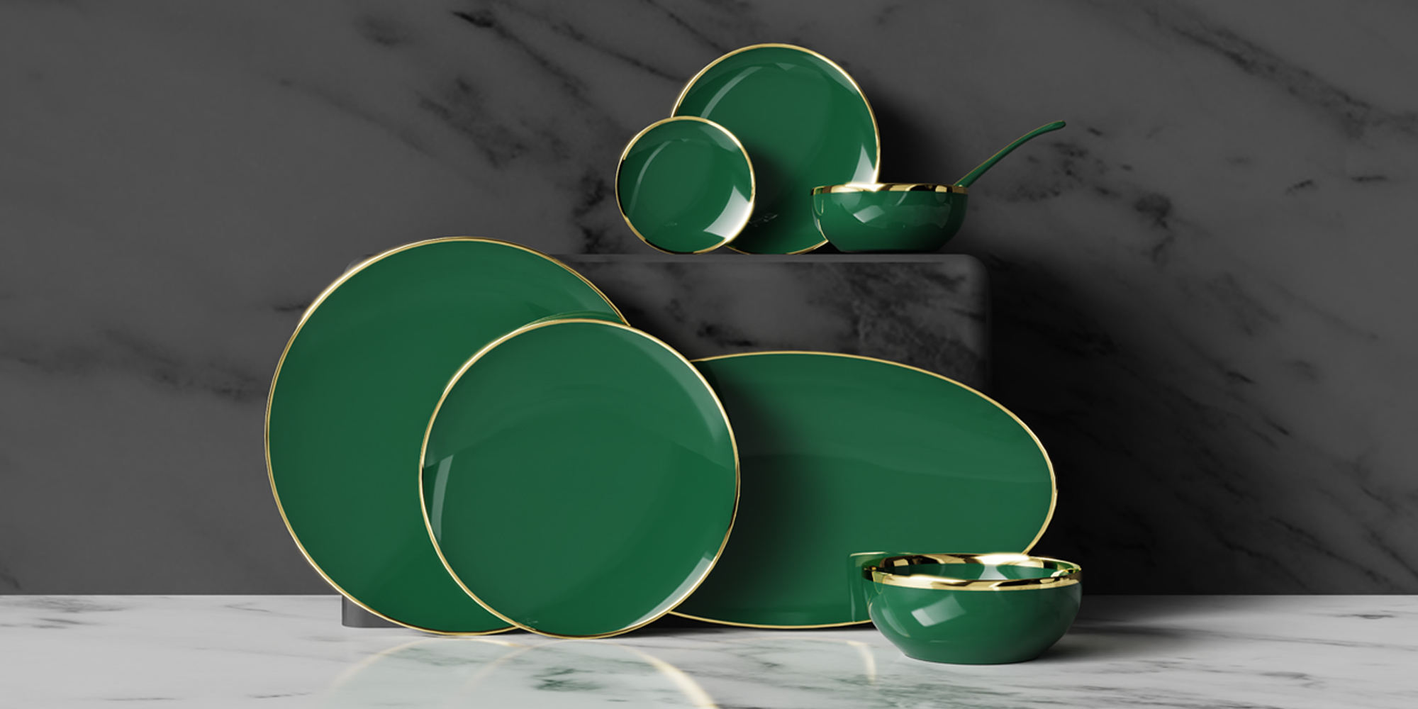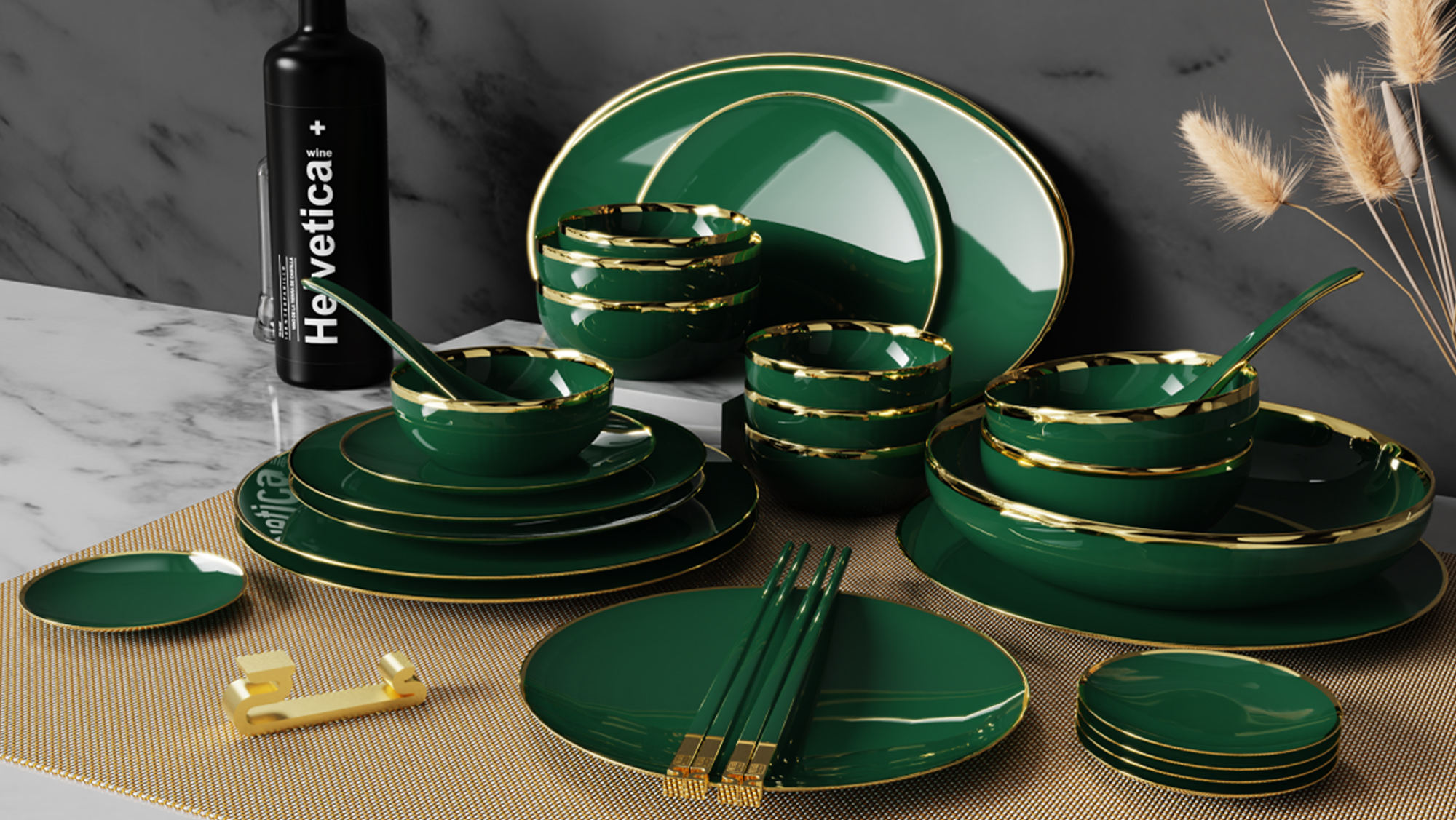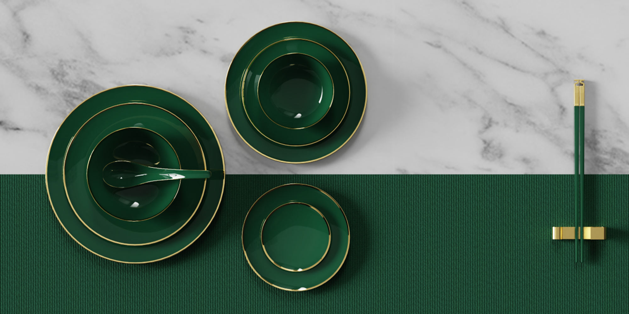 整套餐盤選色以”綠水“為題,鑲嵌金色水紋邊來點綴餐盤,即簡約大氣又為餐盤提升精致亮點,筷子和筷托統一龍舟元素,便有龍行湖上的既視感。