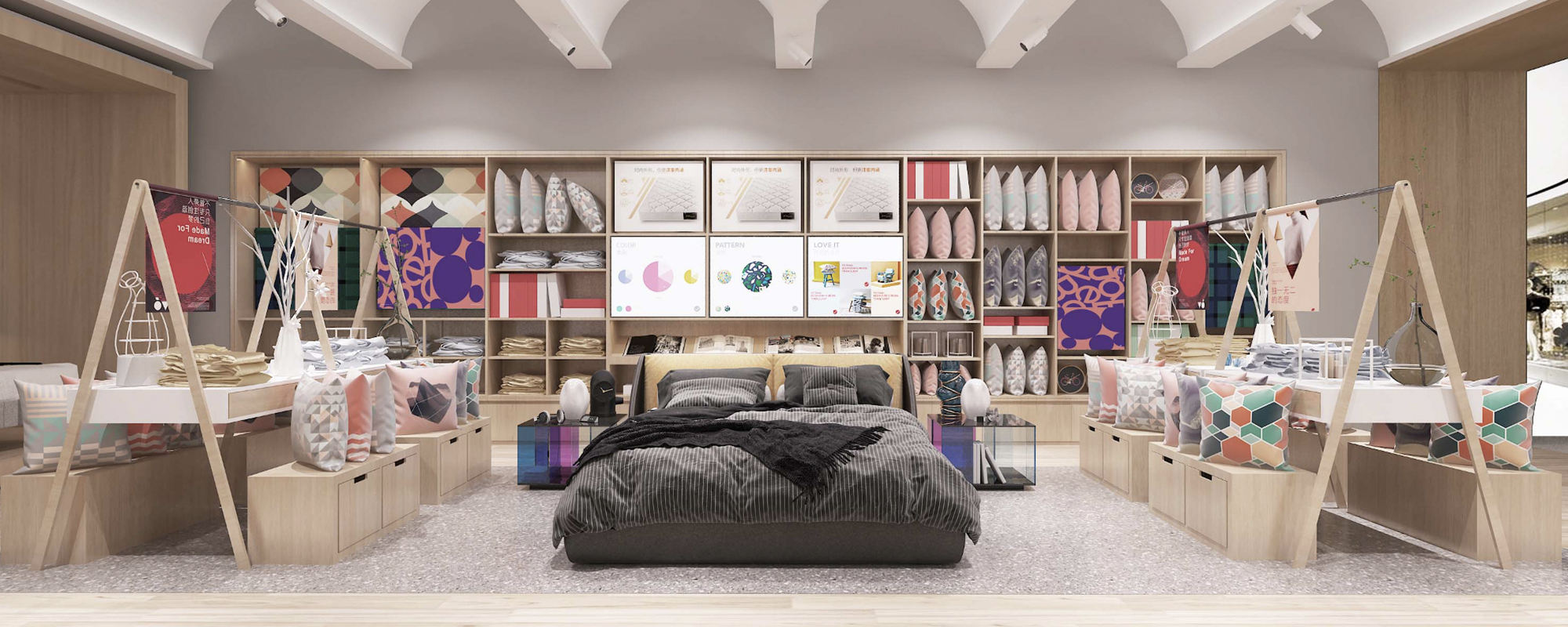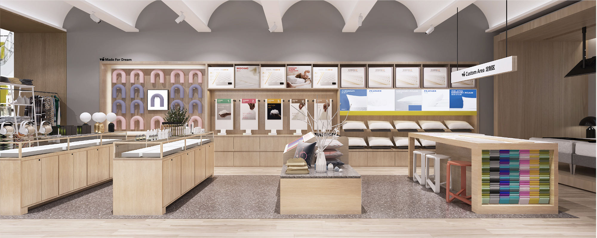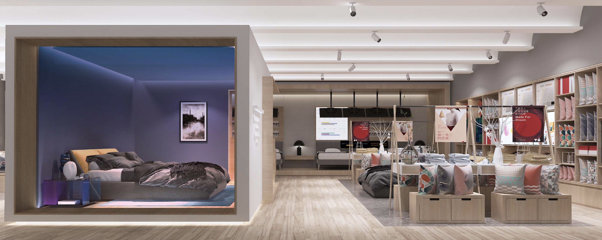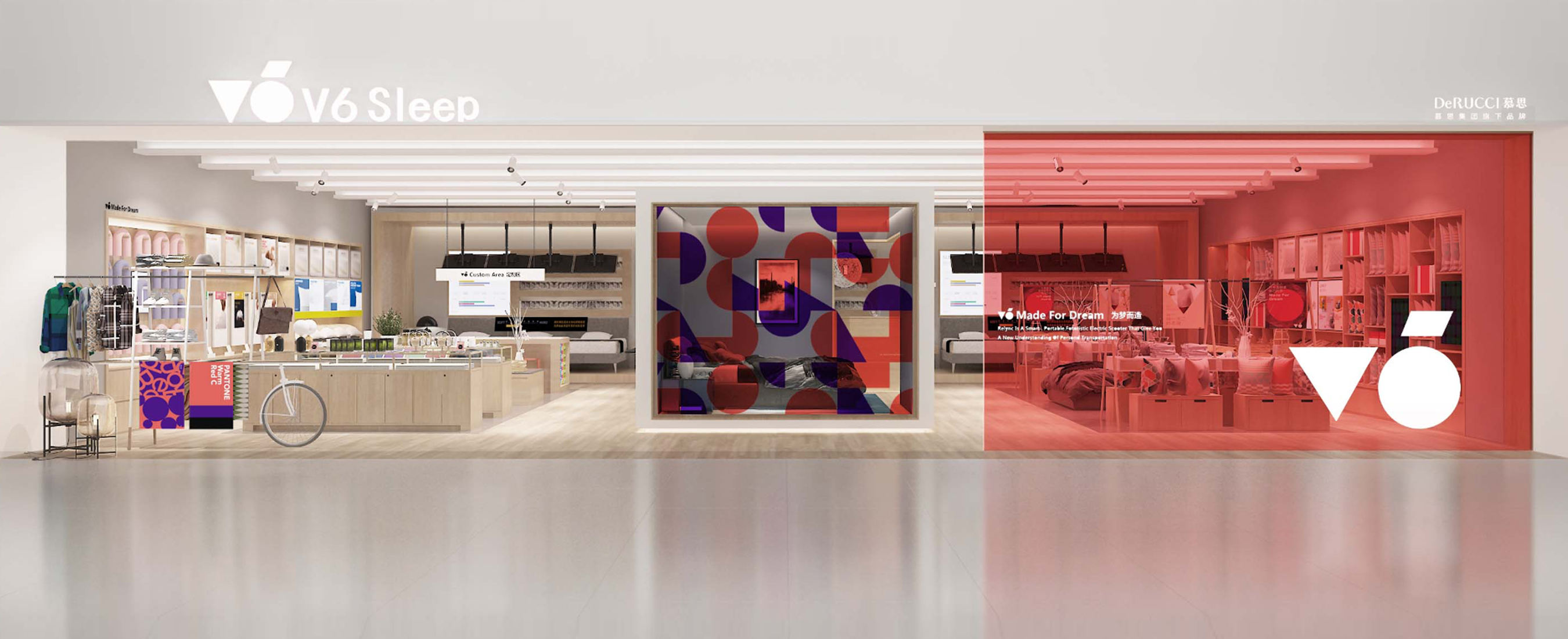 慕思V6為慕思旗下的特色副品牌,為年輕、時尚一族提供系統化的結合專業服務和高品質產品的健康睡眠解決方案,以床墊及床架產品為核心,3年的發展累計了2條產品線共62款產品;新空間以核心產品體驗為主,通過定義四大主題及在空間中以主題邏輯鋪貨,構建品牌語言體系,引起用戶共鳴,設計參與式體驗,塑造品牌的創新形象。店內產品可自主體驗,通過多維度觸點體驗幫助用戶清晰產品價值,簡單、快速的做購買決策,促進購買轉化。