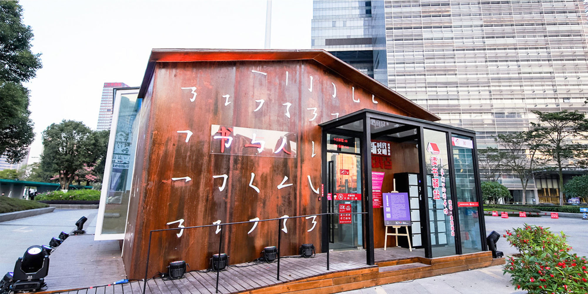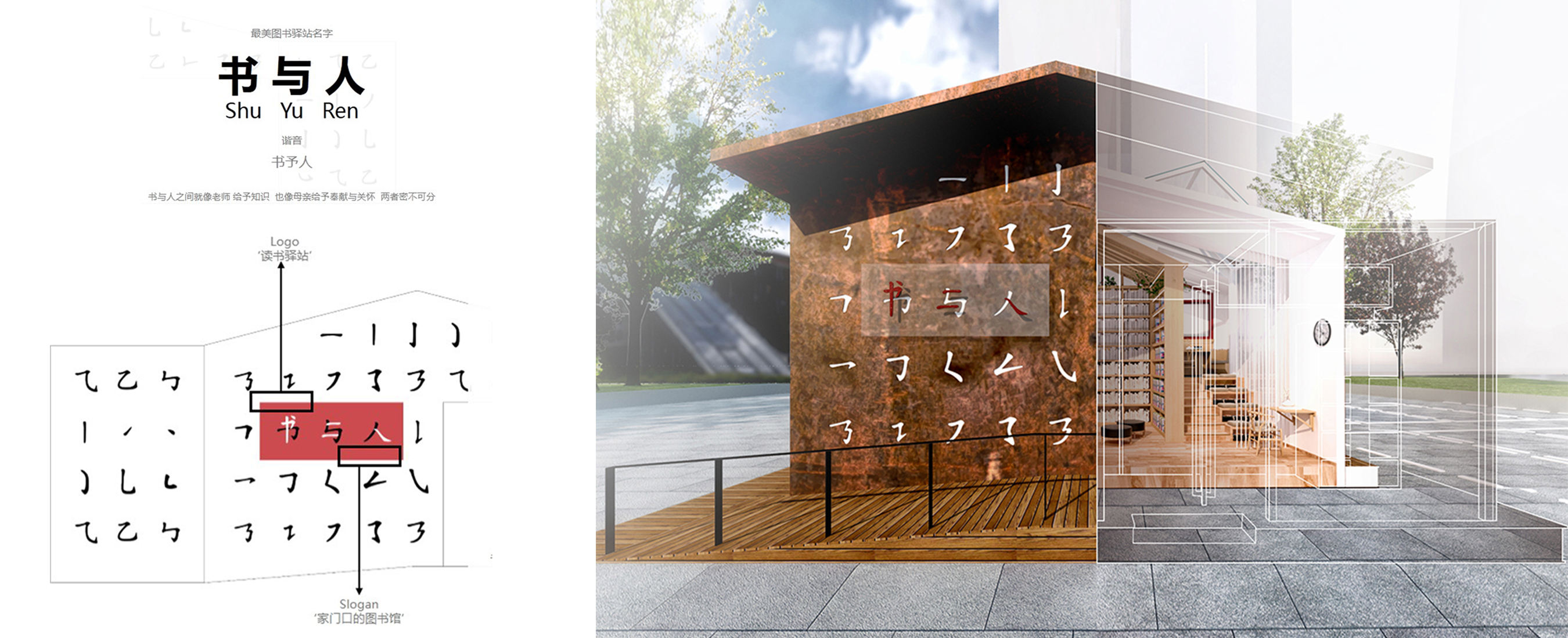 設計師旨在表達知識的獲取與沉淀同城市的發展一樣,時間讓它從石到玉。設計師引入桂城地區平洲玉器的文化元素,以銹蝕金屬指代石頭,以中央的半透玻璃指代通透玉石,讓整體建筑感受像是寶玉被石頭所包裹。建筑體正面墻體上刻印各樣的單獨筆畫元素,象征閱讀與知識承載的內容,正負形組合疊加形成的“書與人”三個字成為此空間的主題。
