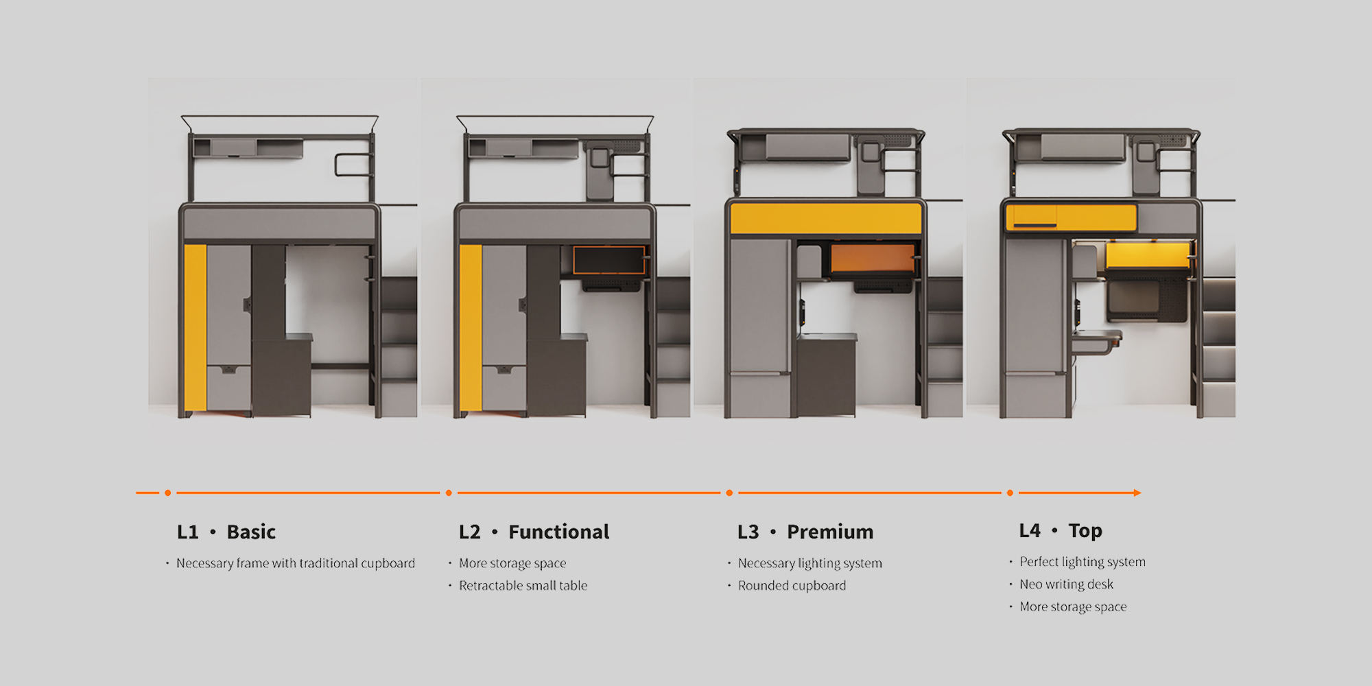 基于鋁合金型材與環保板材搭建出的一整套校用家具平臺。通過組裝可實現架床整體框架、收納箱體及置物平臺、桌面桌板、安全護欄等必要部件的構成。