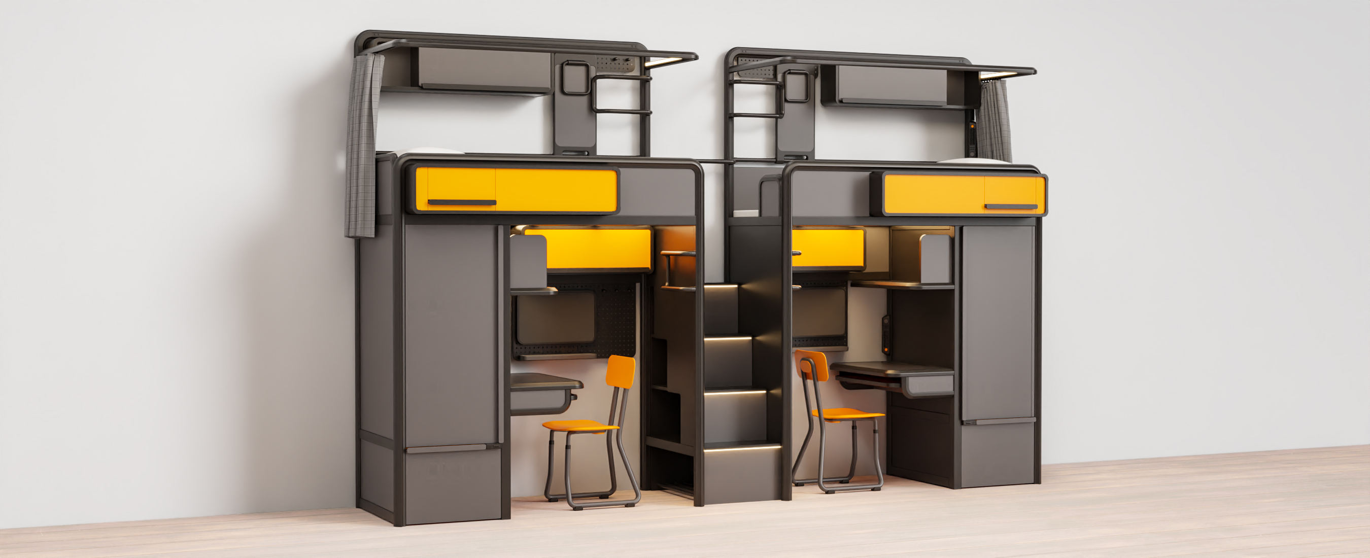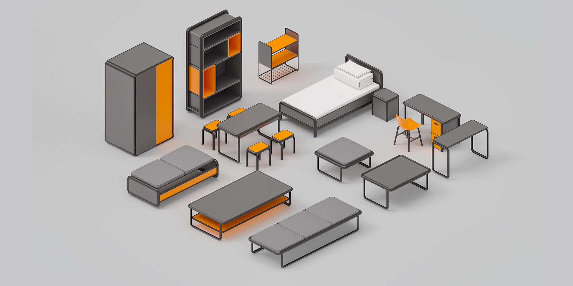 僅需4種主要型材與6種輔助構件,即可完成校用公寓架床的全需求家具場景應用。打破市場產品固有的單一性現狀以保守傳統的拆裝方式,提供新的設計思路與解決方案。