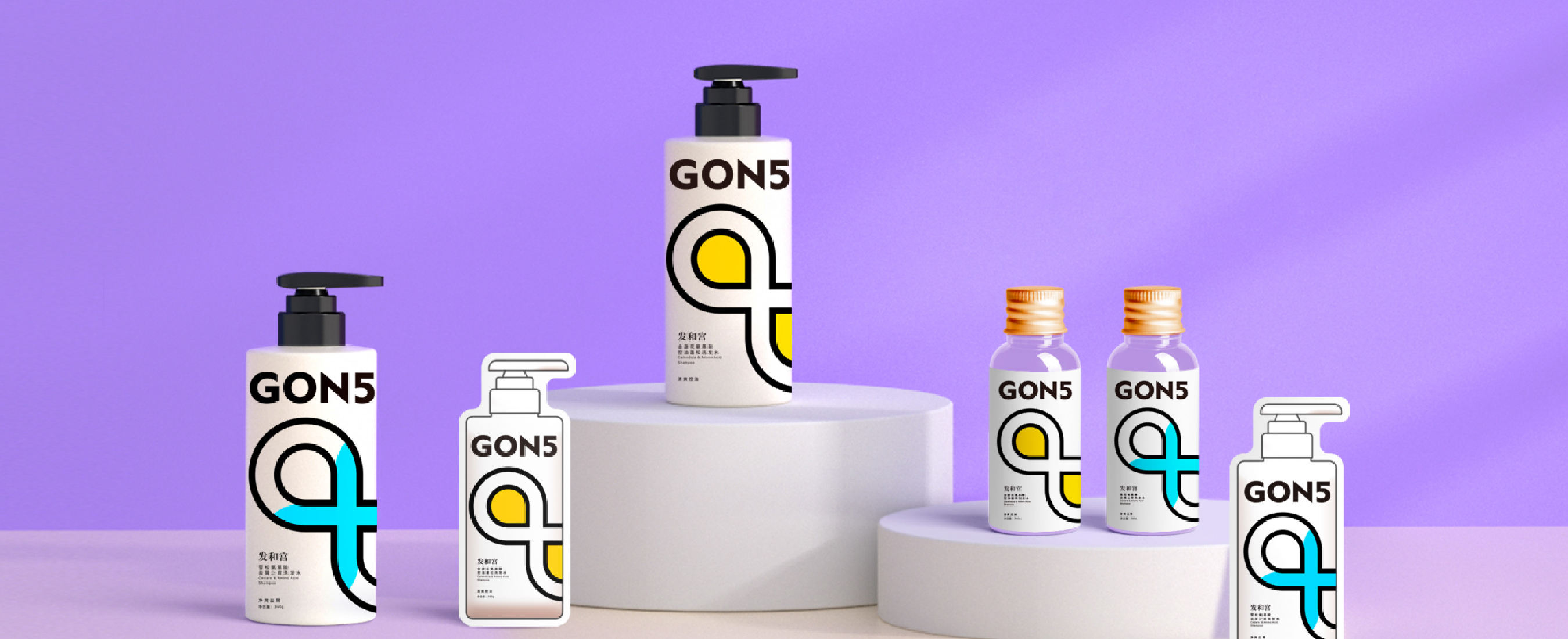 重點突出GON5,體現產品功效/成分,以“探索無限,超越無限”為概念,以“無限循環符號”作為GON5品牌超級符號,年輕、時尚、簡約。